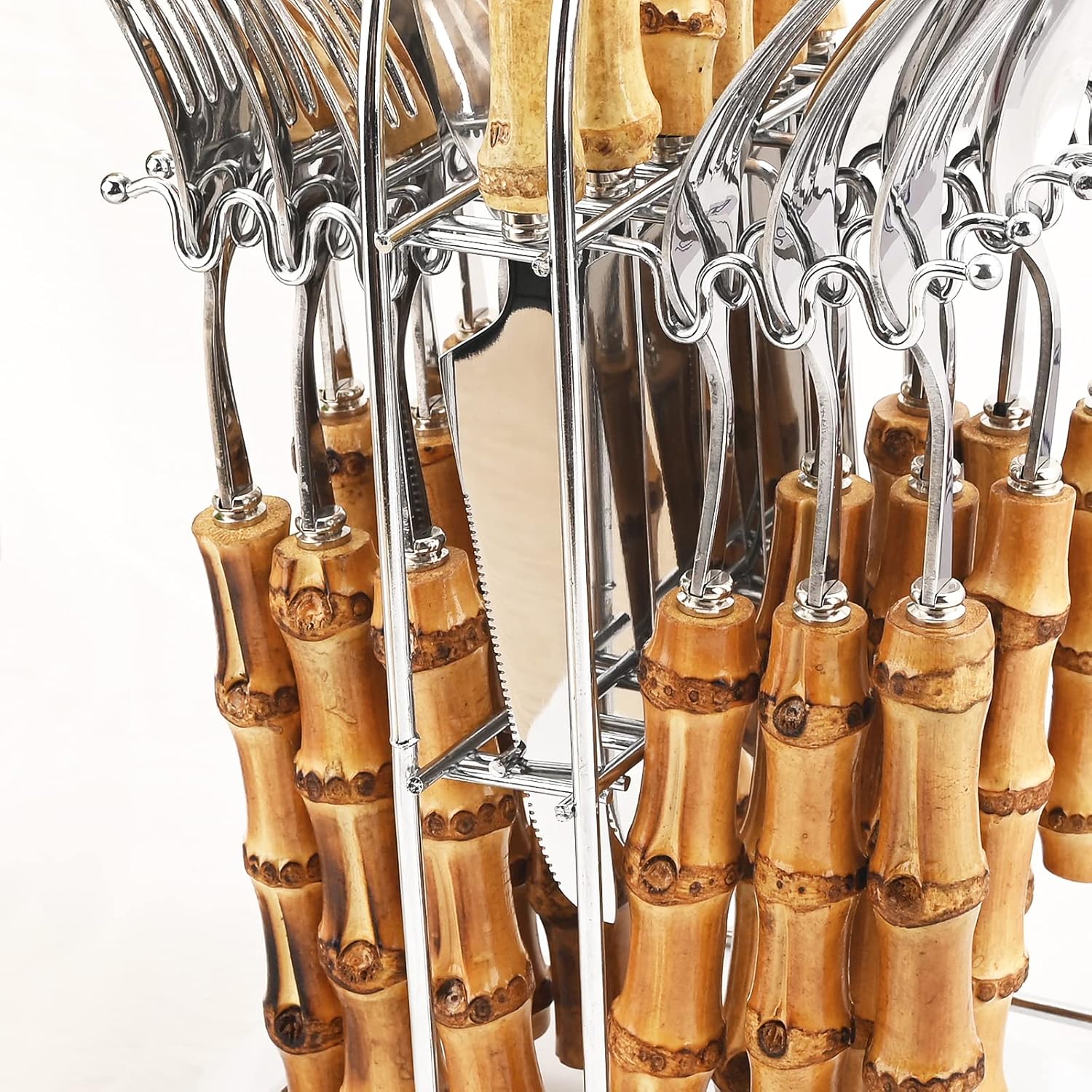 24-Piece Bamboo Silver Stainless Steel Tableware Set With Cutlery Holder, Mirror Polish (Service For 6)